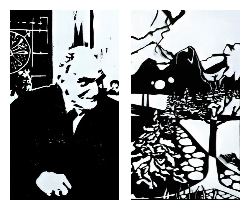 Die Künstlerin Bernhardine Bahri zu ihrer Ausstellung: „Auch im Zeitalter des raschen Mausklicks bieten der Umgang mit Papier- oder Linolmesser immer noch eine Herausforderung. Indem ich mich mit grafischen Elementen beschäftige (weiß/schwarz, Spannung und Balance, Umsetzung von Erde, Wasser, Rinde, Blattwerk etc.), komme ich zur Ruhe, kann mich vom Tagesgeschehen zurückziehen und erlebe eine Form von meditativem Tun.“